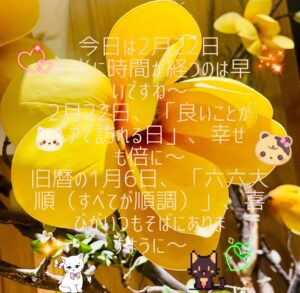 今日は2月22日(日)、2が3つ並ぶ「猫の日」(にゃん・にゃん・にゃん)あるいは「忍者の日」(にん・にん・にん)だそうですよ~今日は猫のように可愛くも、時には忍者のようにカッコよく明るく過ごしましょうね〜💕